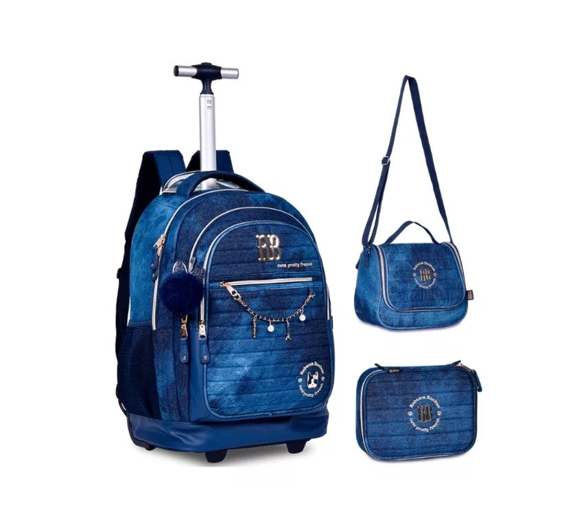 Kit Mochila Carrinho Estojo Lancheira Rebecca Bonbon Jeans