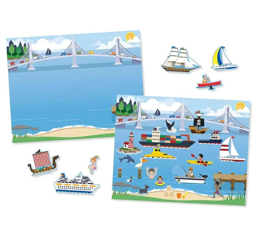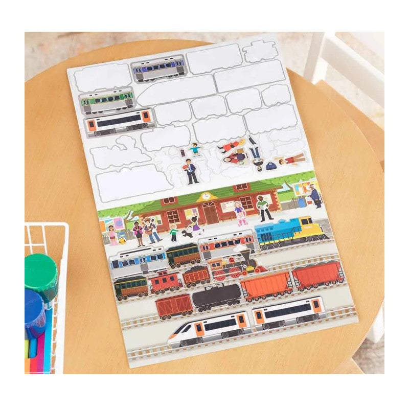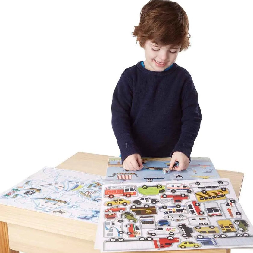 Bloco de atividades com adesivos extragrande Inclui 5 fundos coloridos e mais de 165 estilos de adesivos reposicionáveis. Cenas de fundo removíveis incluem aeroporto, estrada, canteiro de obras, porto e ferrovia. Reposicione os adesivos repetidas vezes! Promove habilidades motoras finas e brincadeiras criativas.