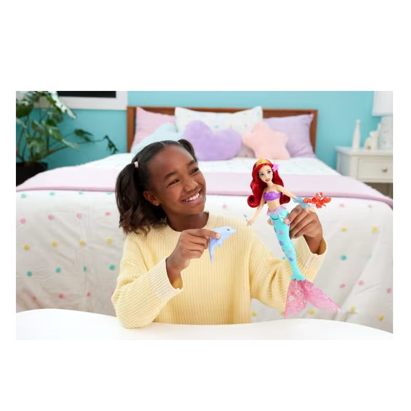 A boneca Disney Princess sereia Ariel Amigos do Oceano da Mattel celebra a vida no fundo do mar. Inspirada na personagem animada do filme A Pequena Sereia da Disney, a boneca Ariel pode "nadar" com suas amigas. Basta apertar os quadris da boneca para que sua cauda de sereia se mova para cima e para baixo, como se ela estivesse realmente nadando. Dois adoráveis amigos animais Sebastian, o caranguejo, e um golfinho que também pode esguichar água podem se prender ao braço dela e se revezar em aventuras de natação pelo mar.