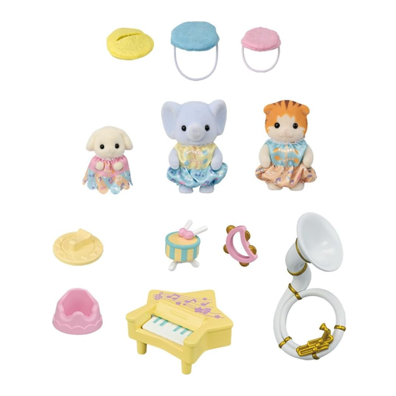 O Conjunto Concerto do Jardim da Infância traz muita música e fofura para o universo Sylvanian! Inclui três bebês vestidos com fantasias de banda e vários instrumentos como tambor, pandeiro, sousafone e piano em formato de estrela. Ideal para desenvolver a criatividade musical das crianças, esse set é perfeito para enriquecer o cenário da creche Sylvanian.