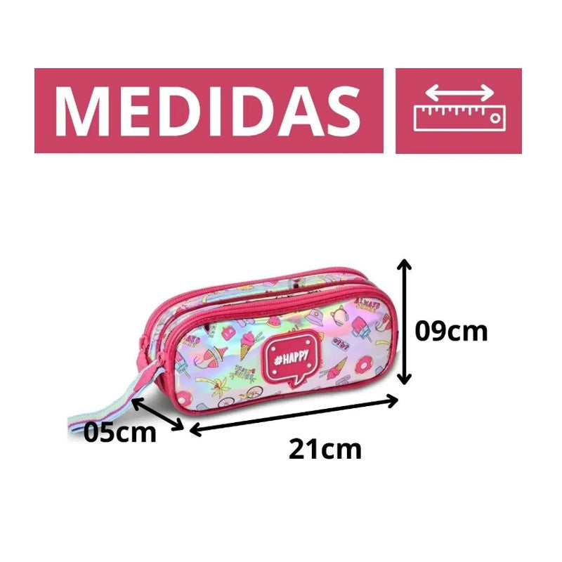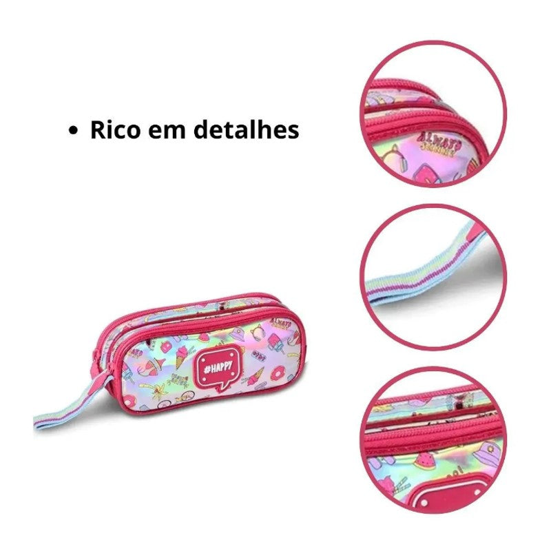 Estojo Holográfico Happy da Clio Kids, um acessório escolar que combina estilo, praticidade e a paixão pela magia. Este estojo é perfeito para as crianças que adoram peças em holográfico. Com uma estampa super fofa que captura a imaginação, o painel frontal em tecido holográfico adiciona um toque ao design. As bordas de silicone garantem durabilidade e resistência, tornando-o ideal para o uso diário na escola.