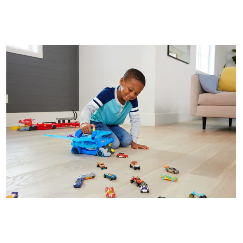 O Hot Wheels Ultimate Dual Dragon Transporter dobra a ação dos dragões com dois dragões que comem, lançam, correm e armazenam os carrinhos Hot Wheels!. Mova-se, ou seja, movido pelo dragão gigante que tem uma característica semelhante a fogo saindo de sua boca e derruba carros e caminhões que bloqueiam seu caminho. Desbloqueie o segundo dragão para transformar o maior em uma enorme pista de corrida de duas pistas.