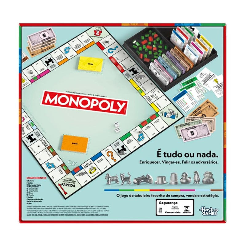 Ganhar muito ou perder tudo no jogo de tabuleiro Monopoly. Nesta edição do divertido jogo familiar, experimentem a jogabilidade clássica que os fãs conhecem e adoram, além de recursos aprimorados. Incluímos uma bandeja de armazenamento elegante para manter dinheiro, cartões e componentes organizados. Também aumentamos o tamanho das fichas, casas e hotéis em relação às edições anteriores para facilitar o manuseio. Os jogadores movem-se pelo tabuleiro comprando o máximo de propriedades que puderem.