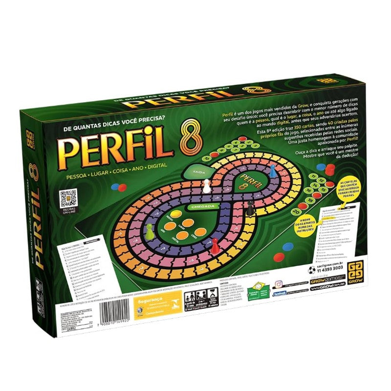Perfil é um dos jogos mais populares da Grow, e acaba de ganhar sua tão aguardada nova edição: o Perfil 8! O desafio continua o mesmo: adivinhar com o menor número possível de dicas quem é a pessoa, qual é o lugar, o ano, o objeto ou o elemento do mundo digital, antes que os outros jogadores descubram! A grande novidade desta versão é que, dentre 350 cartas, 40 delas foram criadas pelos fãs, escolhidas entre diversas sugestões enviadas nós.