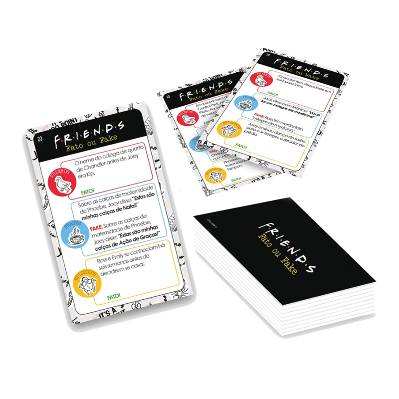 Os fas da série de maior sucesso da TV americana vão passar por uma prova de fogo: quem vai acertar mais questões? São 360 perguntas sobre os 30 anos de sucesso de Friends, com detalhes sobre seus mais de 200 episódios. São 3 temas (frases, episódios e friends) para o jogador responder se é fato ou fake cada afirmação!
