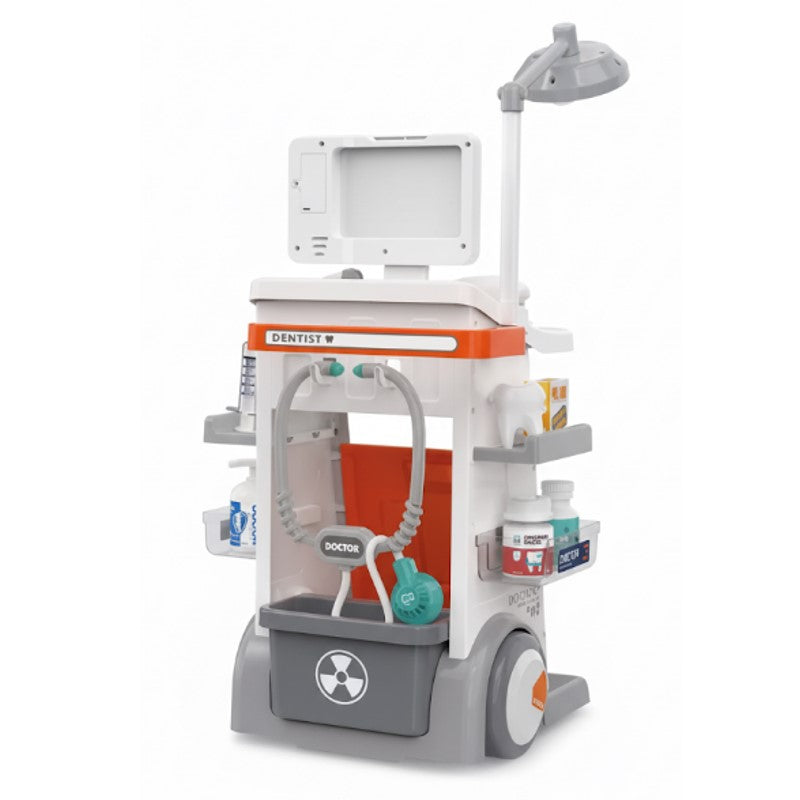 Este é um carrinho de brinquedo de médico, com um design realista que simula um carrinho de hospital de verdade. Ele vem com vários acessórios de faz de conta, como um monitor que simula um eletrocardiograma (ECG) e uma lâmpada que imita as de consultório. O carrinho possui diversas prateleiras e compartimentos para organizar os frascos de remédios de brinquedo, além de uma gaveta para guardar acessórios médicos como seringas e outros instrumentos. A estrutura do carrinho é feita de plástico durável, e suas rodinhas permitem que a criança o leve para onde quiser.