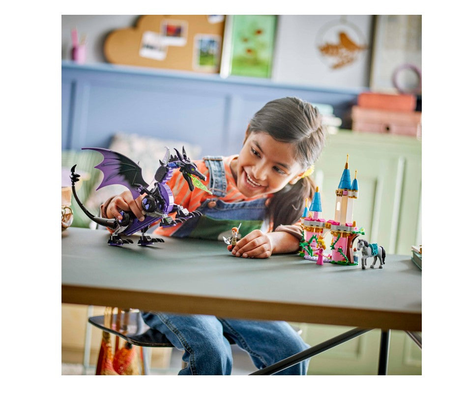 Histórias épicas aguardam crianças e fãs da Bela Adormecida da Disney com mais de 7 anos enquanto criam este conjunto Disney Princess Maleficent's Dragon Form. O conjunto de construção é uma ideia divertida para presente da Disney e tem uma seção de ponte com torres e espaço para uma cama, uma roda giratória e outros iniciadores de brincadeira. Há figuras de miniboneca Disney de Aurora e Príncipe Philip, uma figura de cavalo Samson Disney e uma figura de dragão articulável Disney com cabeça, pernas e cauda móveis, além de asas dobráveis.