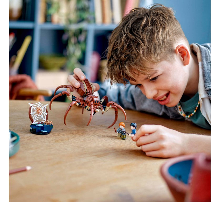Deixe seu jovem bruxo, bruxa ou trouxa encenar aventuras mágicas na Floresta Proibida LEGO Harry Potter com este conjunto de brinquedos de aranha Aragogue (76434). Um presente mágico para meninos, meninas e qualquer fã de Harry Potter a partir de 7 anos, ele apresenta a maior e mais realista figura de brinquedo LEGO Aragogue construída em peças, com pernas, presas e pedipalpos ajustáveis, além de minifiguras de Harry Potter e Ron Weasley , cada um com rostos felizes ou assustados, além de varinhas e um elemento de lanterna. O conjunto também inclui uma pequena cena edificável da Floresta Proibida, 2 figuras de aranha bebê e uma teia de aranha para adicionar às encantadoras possibilidades de jogo.