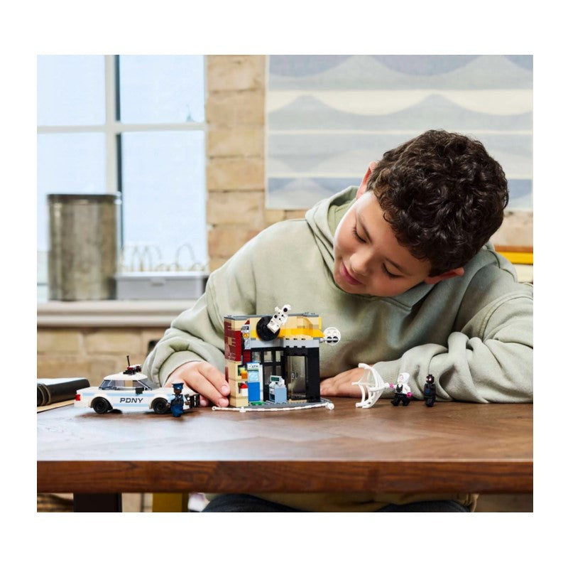 O conjunto de jogos do Homem-Aranha vem com 4 minifiguras: Miles Morales, The Spot, Gwen Stacy e o Oficial Jefferson. A loja de conveniência tem um recurso de parede explosiva que permite que o caixa eletrônico seja removido. Os acessórios incluem uma corda de teia longa e flexível e uma teia flexível que é grande o suficiente para envolver uma minifigura. O carro da polícia abre para permitir que 2 minifiguras sejam colocadas dentro.