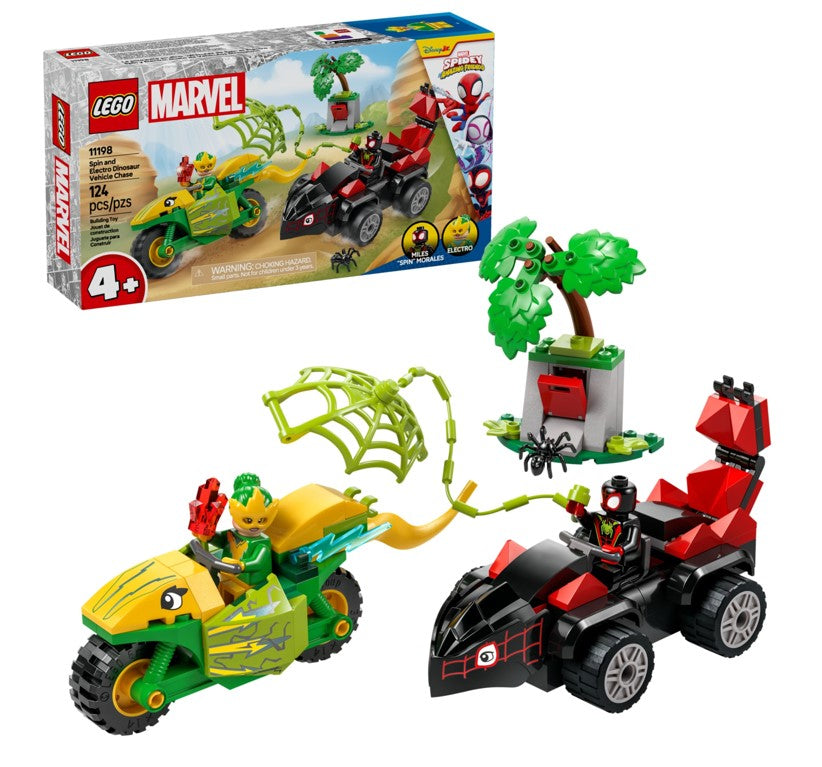 O conjunto recria a ação da temporada 'Dino-Webs' do programa de TV Spidey And His Amazing Friends. Inclui 2 minifiguras de super-heróis e 2 veículos dinossauros de empurrar: Miles "Spin" Morales em um carro de estegossauro e Electro em uma motocicleta de dilofossauro. Um grande elemento de teia, um cristal escondido dentro de uma rocha, além de acessórios de paisagismo inspiram a dramatização criativa das crianças. Dentro da caixa, cada bolsa contém tijolos e um grande tijolo inicial para um modelo e personagem rápidos de construir, para que a brincadeira comece rapidamente. Instruções intuitivas são fornecidas na forma de um guia de história com imagens coloridas.