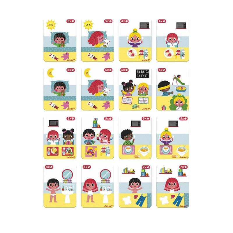 A premissa é simples: recrie a cena cotidiana indicada no cartão e associe um horário a ela. A que horas tomo meu café da manhã? Quando é a hora da soneca? E muitas outras. Graças aos 75 ímãs e aos 8 cartões modelo de dupla face incluídos, podem ser reproduzidas 16 cenas cotidianas! Uma vez que o livro está aberto, as crianças podem colocar os ímãs no lado magnético onde permanecerão no lugar: perfeito para viagens longas de carro ou esperas.