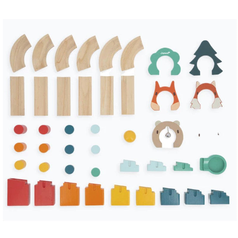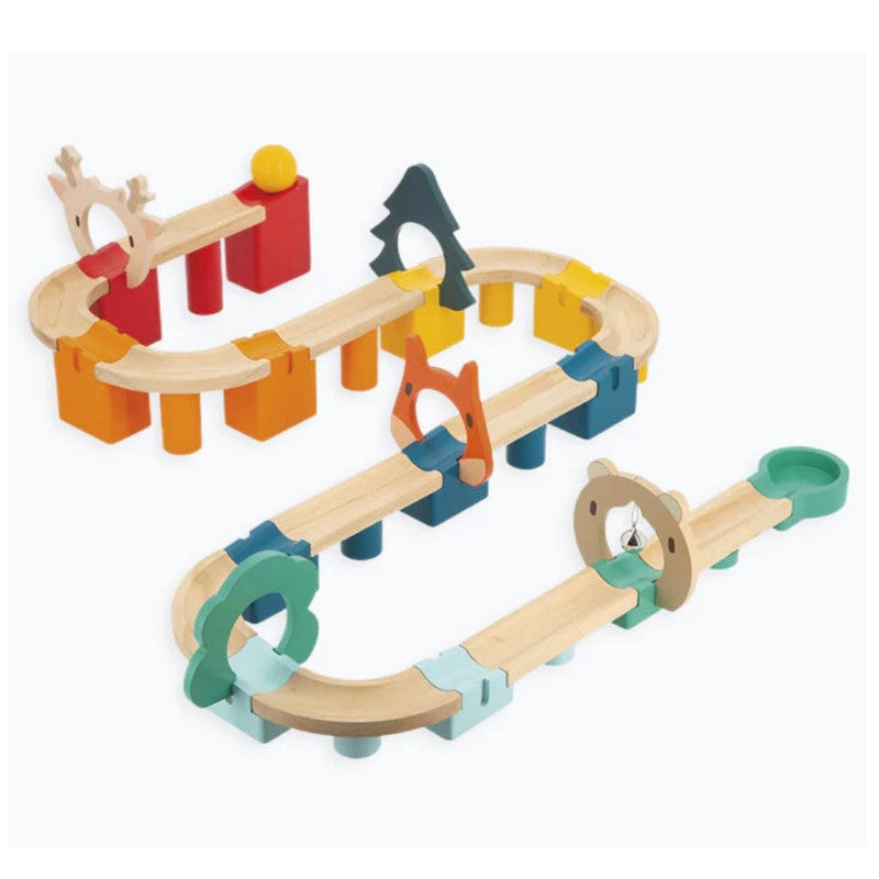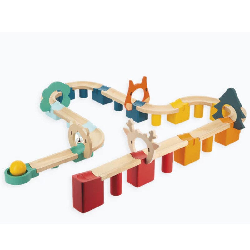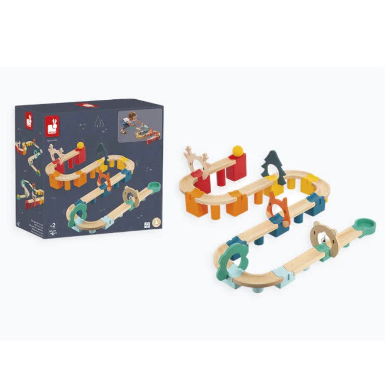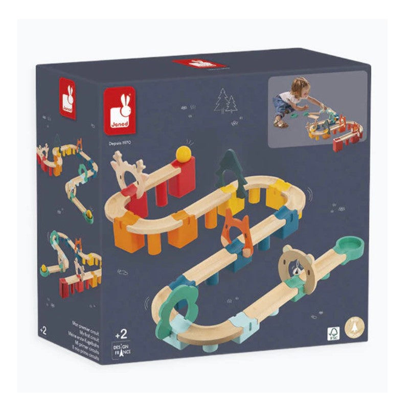 O primeiro circuito de bola para crianças pequenas, suspense e criatividade garantidos. Um verdadeiro curso para montar repetidamente, muitas combinações são possíveis. Este conjunto completo contém 44 peças de madeira no total, sendo elas: 13 conectores, 12 pilares, 12 trilhos, 6 portas e 1 bola. Uma ótima maneira de desenvolver habilidades motoras finas, imaginação e resolução de problemas simples.
