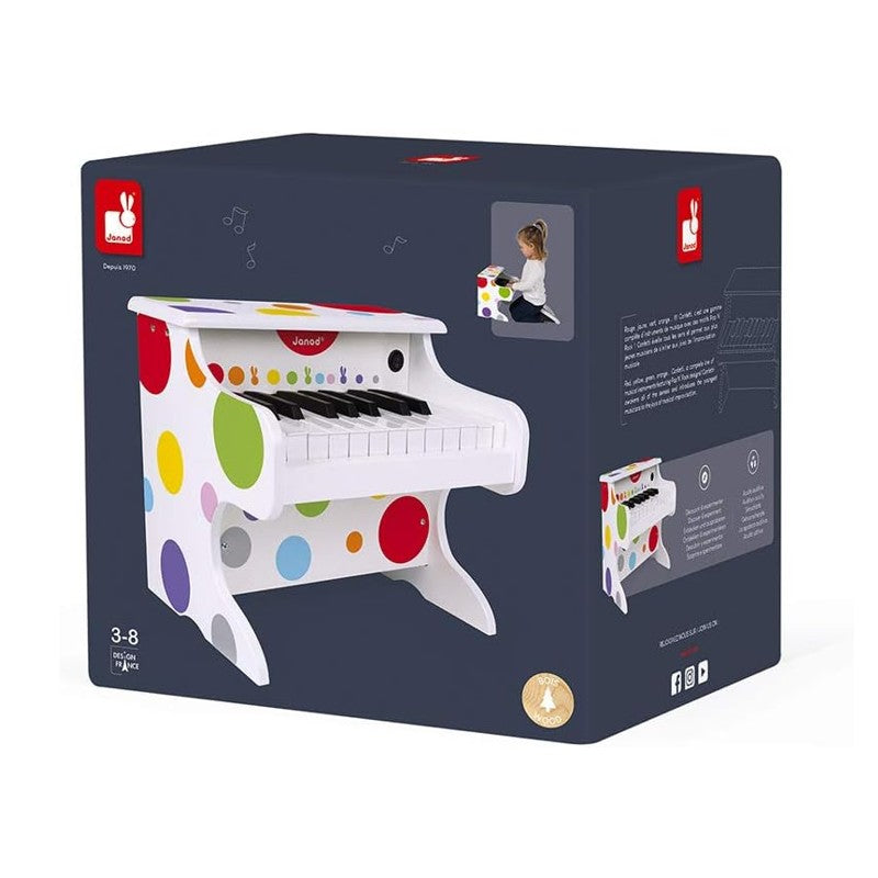 Esta linda réplica de piano com bolinhas coloridas vai encantar os músicos mais jovens a partir de 3 anos que desejam descobrir o prazer do piano e da música. Quatro partituras foram incluídas para que seu filho possa tocar o piano como um verdadeiro prodígio (Alouette, Brilha, Brilha, Estrelinha, À Luz da Lua, Frère Jacques). Seu filho também poderá criar sua própria música de acordo com sua imaginação, graças às 18 teclas que produzem sons diferentes. Prático, o piano desliga automaticamente após 2 minutos se seu filho não estiver mais brincando com ele. Confetti é uma linha completa de brinquedos de instrumentos musicais com designs Pop N' Rock!