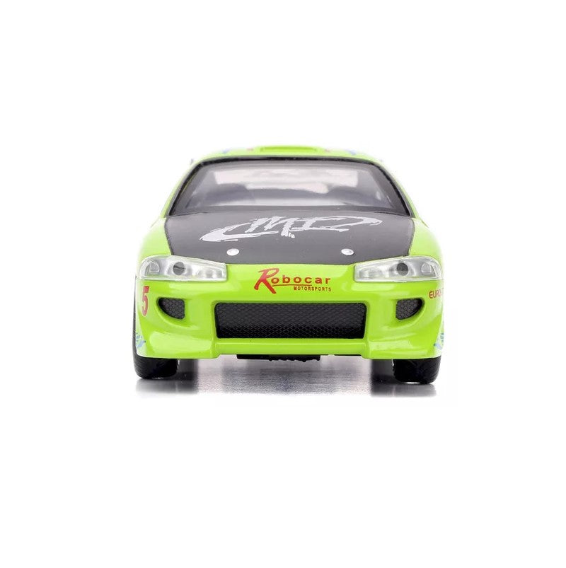 Mitsubishi Eclipse verde, carro emblemático do primeiro filme. Este modelo é marcado pelo verde vibrante que combina perfeitamente com os detalhes personalizados, como os adesivos nas laterais e o design de rodas esportivas. No filme, o Eclipse de Brian é um dos carros que compete em algumas das corridas mais intensas, e sua estética agressiva e jovem se reflete no design da miniatura. O modelo é rico em detalhes, com o estilo único de carro de rua, incluindo os faróis, capô ventilado e portas que se abrem , dando um visual imersivo que traz à tona a essência do carro original.