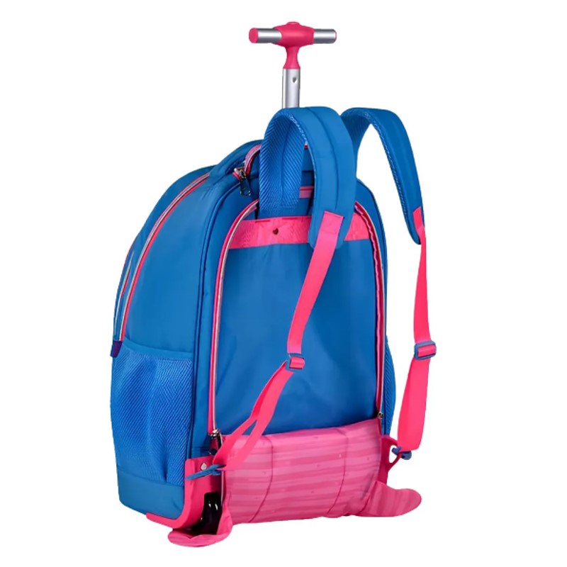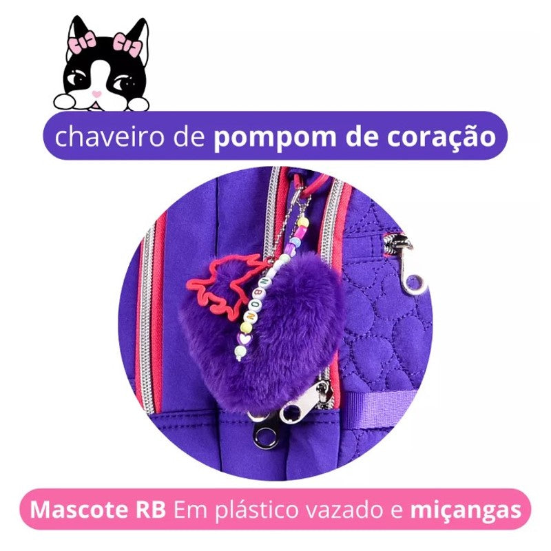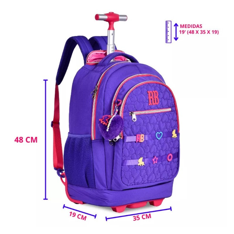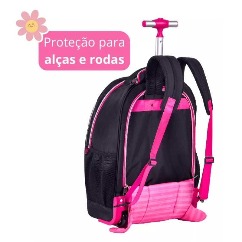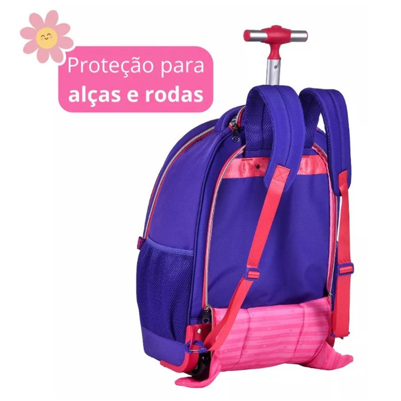 Mochila de rodinhas: Possui um design moderno com detalhes exclusivos da personagem Rebecca Bonbon, a adorável bulldog francesa, estampada em cores vibrantes. As rodinhas facilitam o transporte, evitando o peso nas costas, e a alça retrátil ajustável é ergonômica, oferecendo conforto. A mochila conta com um amplo espaço interno para cadernos, livros e materiais escolares, além de bolsos laterais para garrafinhas e pequenos objetos.