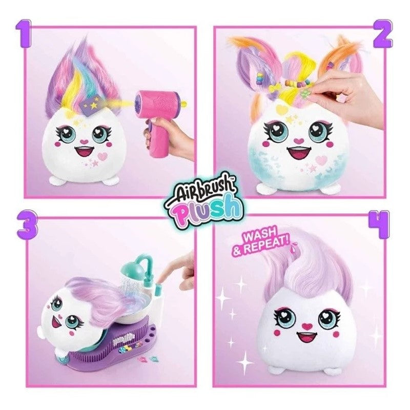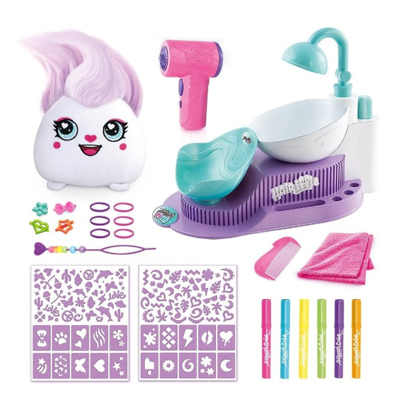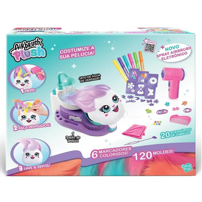 O Salão de Beleza AirBrush permite criar e recriar penteados super estilosos e coloridos quantas vezes quiserem, garantindo diversão contínua e sem sujeira, pois a tinta é facilmente removível. Com 6 cores vibrantes e 120 stencils adesivos. Oferece varias opções para personalização, incentivando a criatividade e a imaginação, permitindo criar looks únicos e personalizados. Inclui pentes, elásticos, presilhas e outros acessórios para decorar e modelar os cabelos da pelúcia, tornando cada look único e cheio de estilo. Basta aplicar a cor com o spray, decorar, modelar e, depois, lavar para começar tudo de novo, sem preocupações, promovendo a autonomia da criança.
