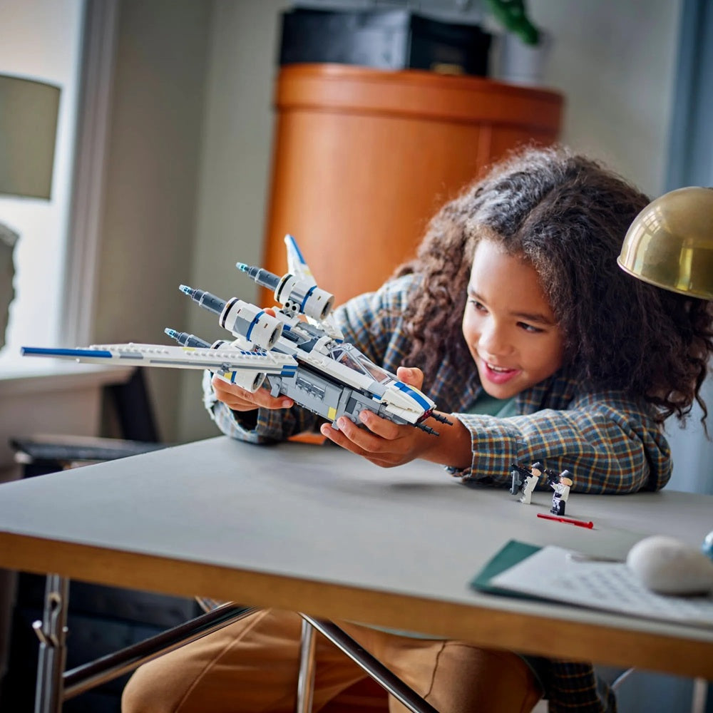As crianças se unem a Cassian Andor e K-2SO para recriar cenas da 2ª Temporada de Star Wars : Andor com este kit de modelo montável Rebel U-Wing Starfighter (75399). Um presente divertido de Natal ou aniversário para meninos, meninas e fãs de Star Wars a partir de 8 anos, o brinquedo LEGO U-Wing Starfighter, construído com peças, possui uma função de oscilação de asa para ajustar as asas do modo de pouso para a icônica formação em "V" para voo, além de 2 disparadores com mola. A capota do cockpit é liberada pressionando uma alavanca e há um compartimento que abre para passageiros e carga.