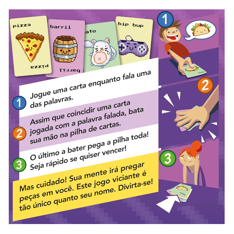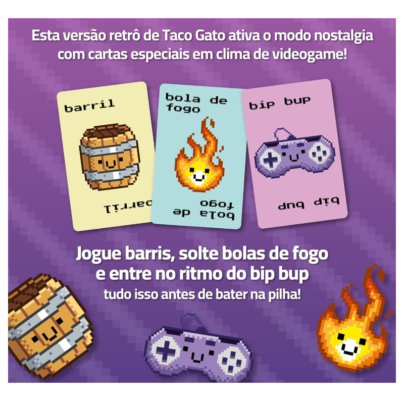 Jogue uma carta enquanto fala uma das palavras. Assim que coincidir uma carta jogada com a palavra falada, corra para bater sua mão na pilha central. O último a bater pega a pilha toda. Seja rápido para ser o primeiro a se livrar das suas cartas e vencer o jogo. Mas cuidado! Esta versão retrô de Taco Gato ativa o modo nostalgia com cartas especiais em clima de videogame: jogue barris, solte bolas de fogo e entre no ritmo do bip bup – tudo isso antes de bater na pilha! Prepare-se para apertar os botões e colocar seus reflexos à prova. Taco Gato 8-bit é um tributo aos clássicos dos videogames e garante ainda mais risadas, caos e desafios para sua turma. Press start e divirta-se!